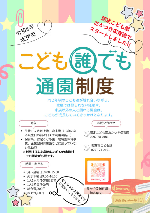 2026年4月7日 『こども誰でも通園制度』がスタートしました。 By あかつき保育園 お知らせ 0 Comments 坂東市における「こども誰でも通園制度(乳児等通園支援事業)」実施施設として、あかつき保育園が認可を受けました。 令和8年4月から受け入れをスタートし、家庭で子育てしている保護者の方々に対して、坂東市と協力